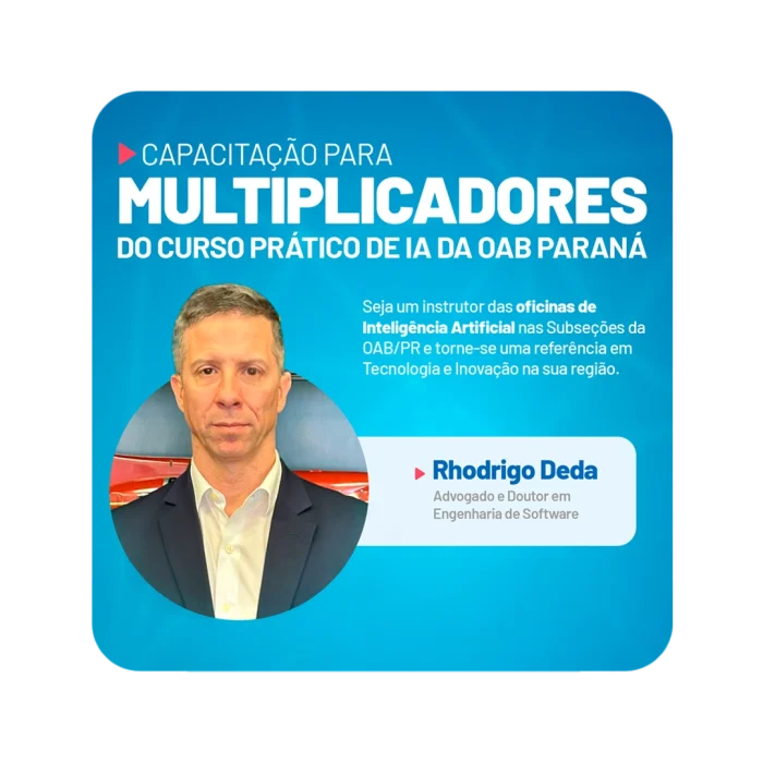 Aliança TecnológicaOAB Paraná Conectando a advocacia ao futuro. Uma parceria entre Célula de InovaçãoLaboratório de InovaçãoEscola de Tecnologia da ESA ParanáComissão de Inteligência ArtificialComissão de Inovação, Gestão e EmpreendedorismoObservatório do Poder Judiciário Destaque Saiba mais Hackathon da OAB Paraná desafia equipes a inovar com IA no acesso à Justiça Abertas as inscrições para o Hackathon de Inteligência Artificial da OAB-PR OAB-PR lança curso gratuito de Inteligência Artificial aplicada ao Direito Agenda Saiba mais 16/12 | Capacitação para Multiplicadores do Curso Prático de IA da OAB Paraná Parceria